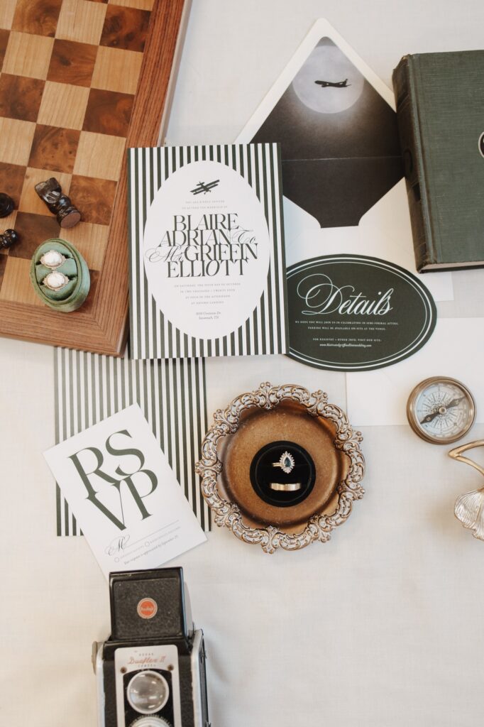 Pro tip: Gather your invitation suite, rings, vow books, and accessories in one place on the wedding morning so your photographer can capture these details seamlessly.