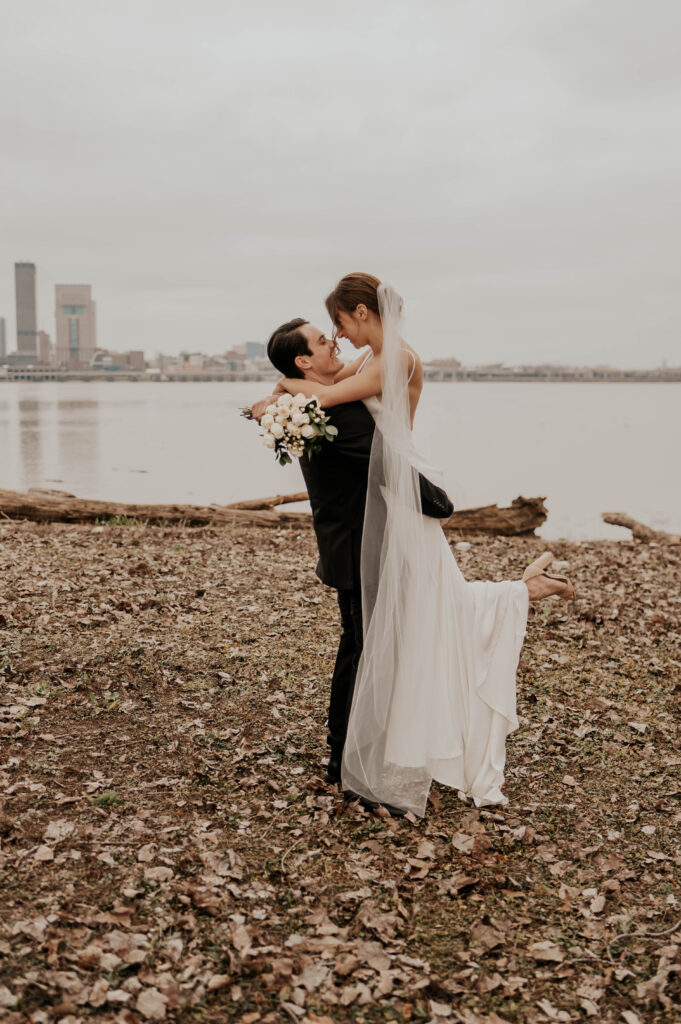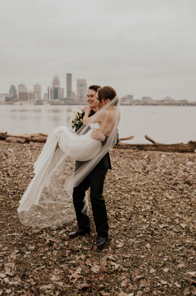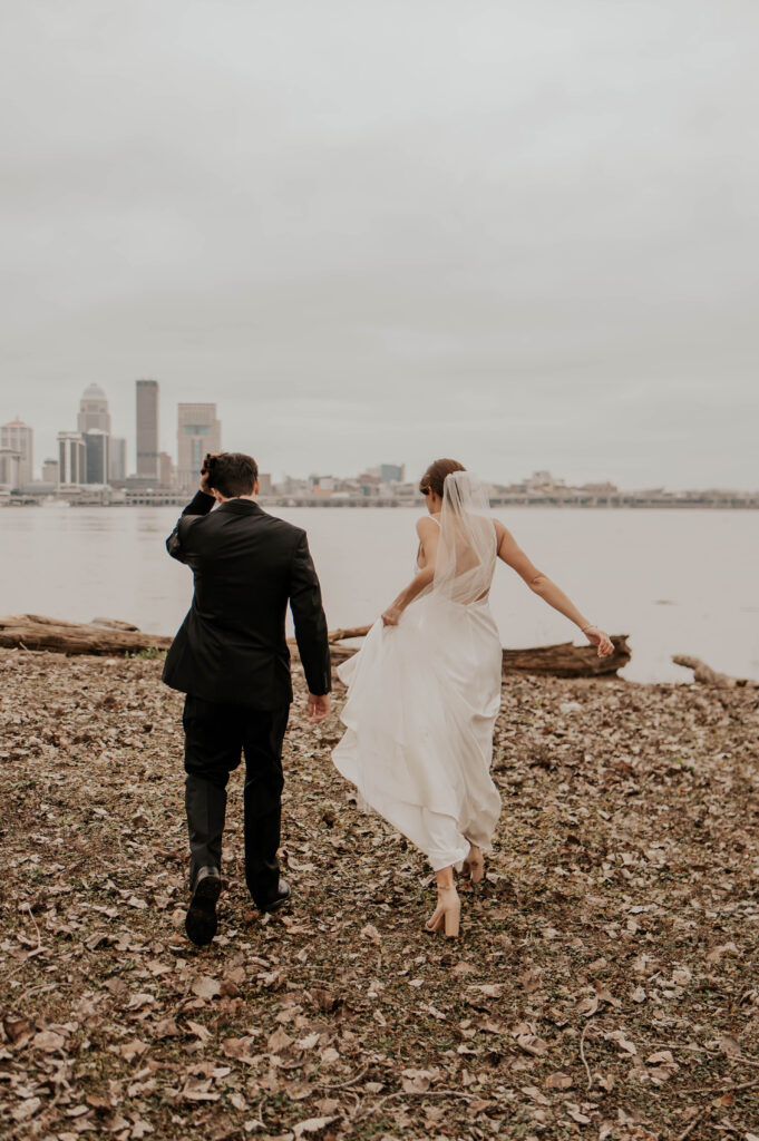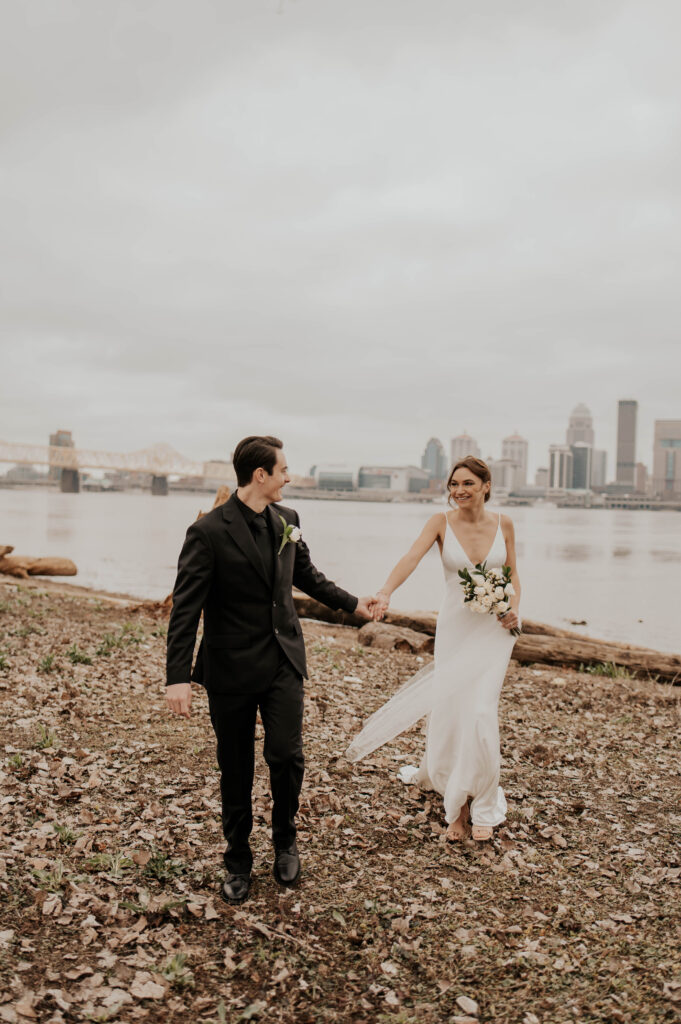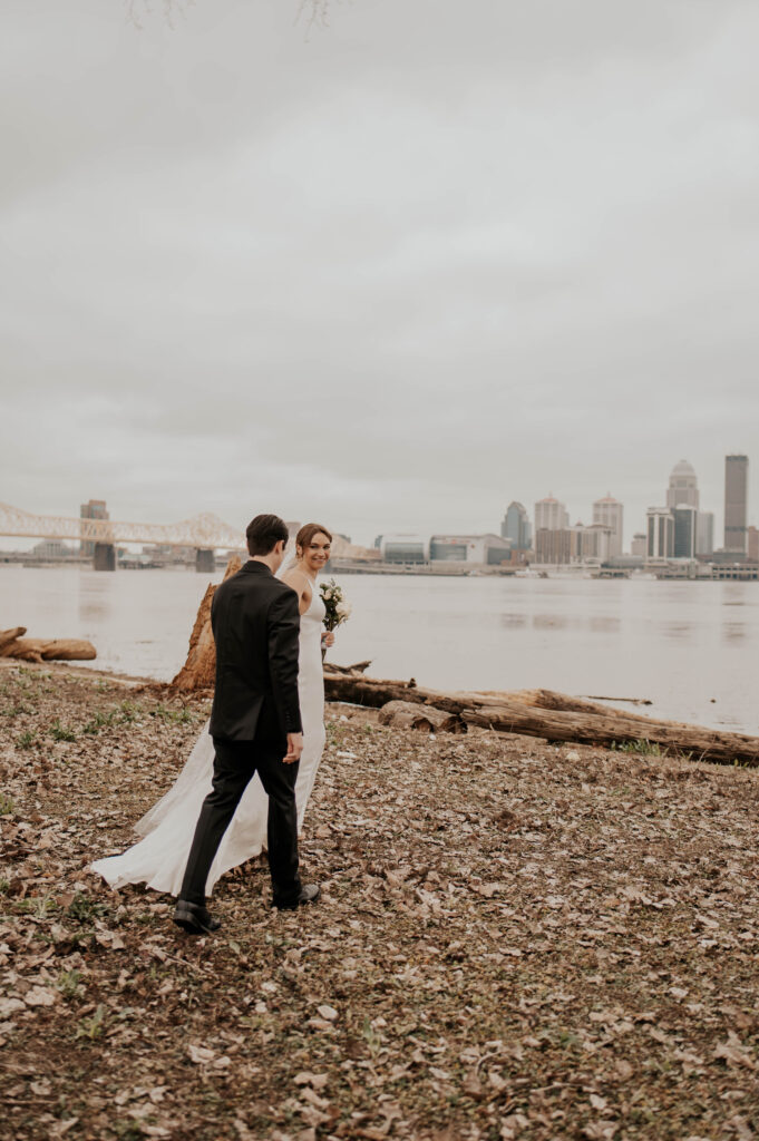 Just across the water, you’ll find the Louisville skyline, a powerful, urban backdrop that pairs perfectly with crisp, modern wedding photography. Whether it’s a quiet moment between the newlyweds or a fun group shot with your bridal party, this view brings depth and grandeur to your gallery.